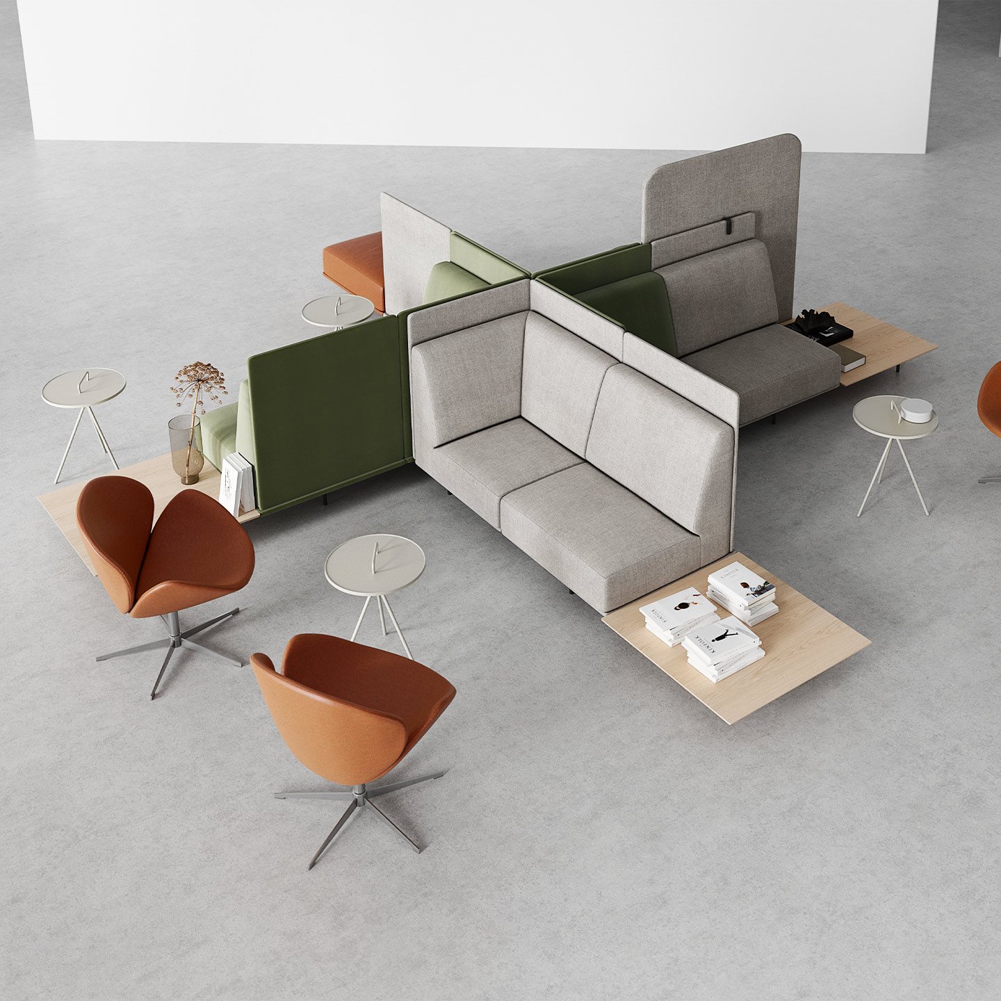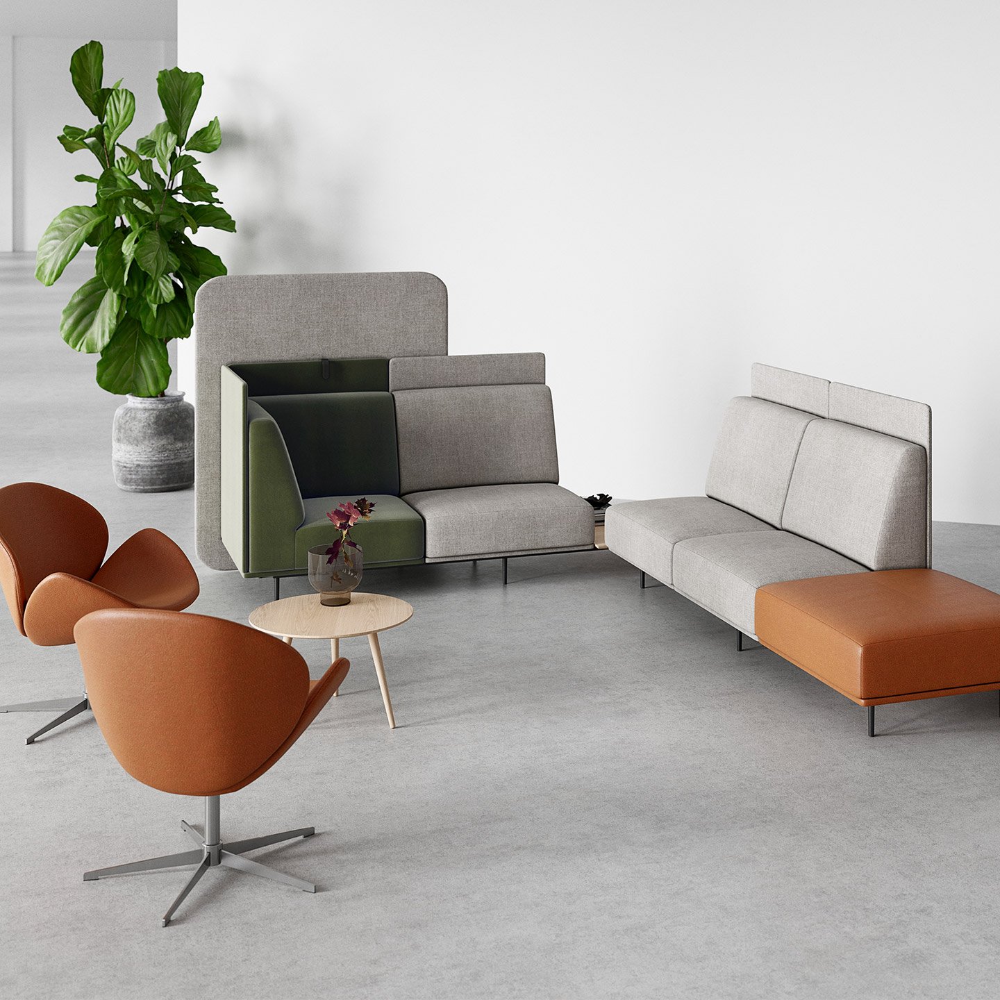 The Toulouse system is built around four modules: a corner seat, single seat with backrest, ottoman and side table. The corner and single seats can be ordered with a low- or high-backrest and feature an attached rigid fabric partition. Extra on-demand privacy arrives via an additional fabric divider.