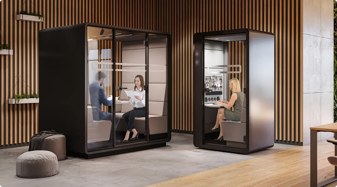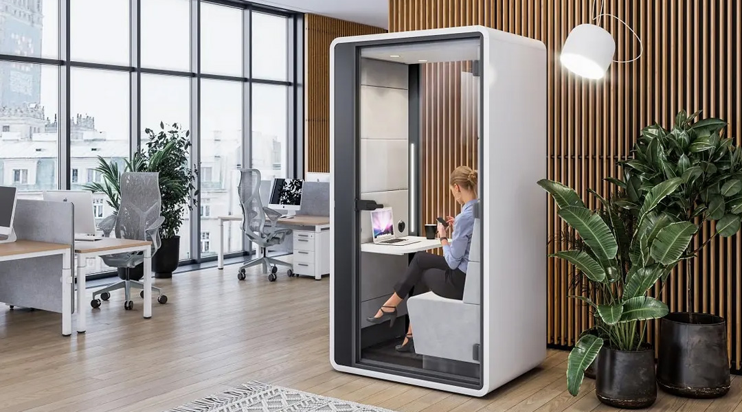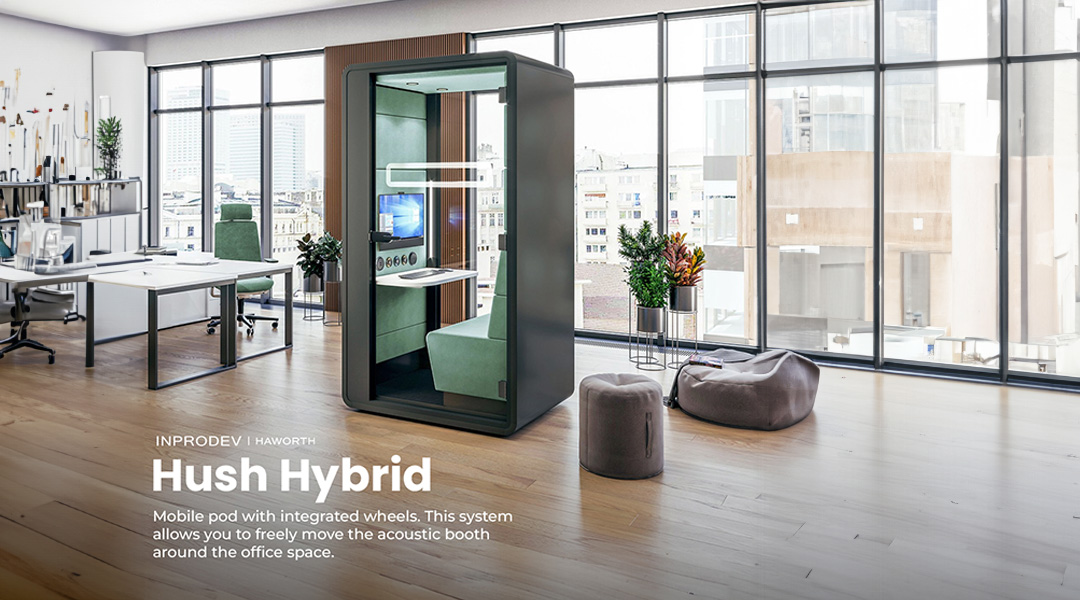 The hushHybrid office booth is superbly designed and manufactured. It provides all the amenities needed for peaceful work, including video conferencing or phone calls. Comfort, acoustics, visual privacy and additional features ensure that working in hushHybrid pods is more efficient than in other settings.