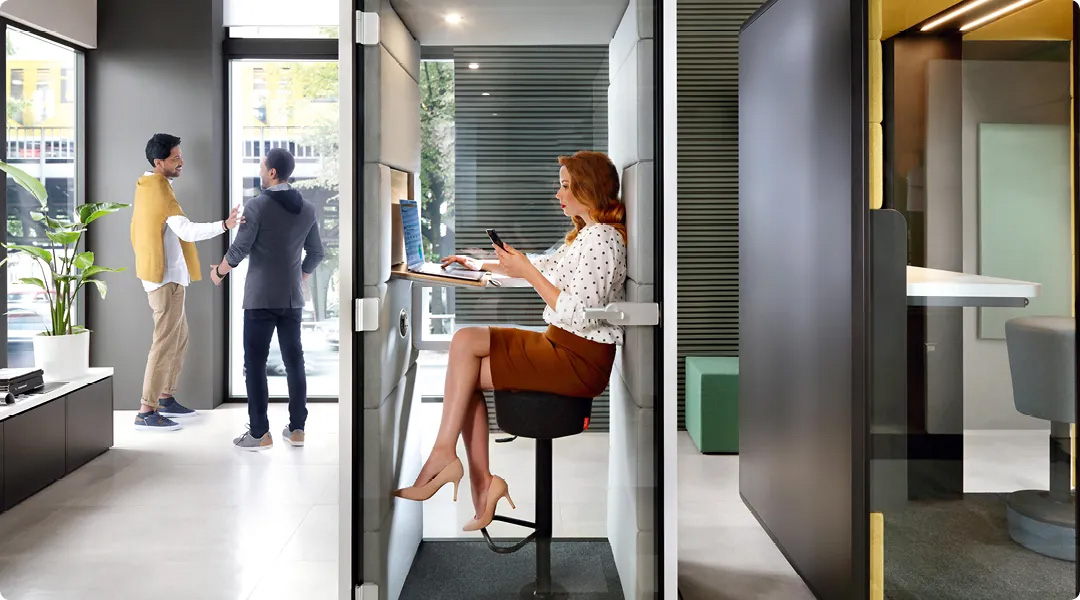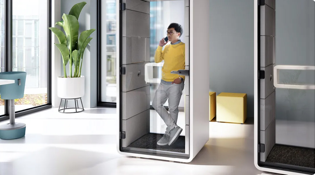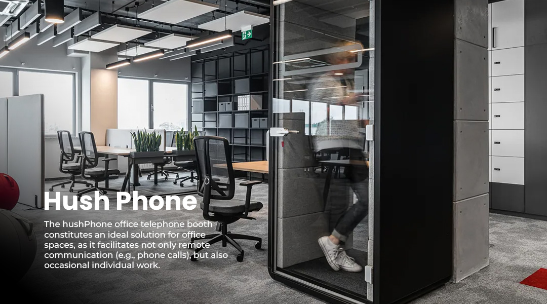 The hushPhone office booth is superbly designed and manufactured. It provides all the amenities needed for temporary individual work, shorter video conferences and phone calls. Comfort, acoustic and visual privacy, and additional features, ensure that working in hushPhone booths is more efficient than in other settings.